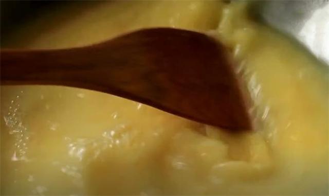 4.把水淀粉倒鍋里,加入水淀粉可以讓玉米面糊更勁道,煮至這種粘稠度就可以了。