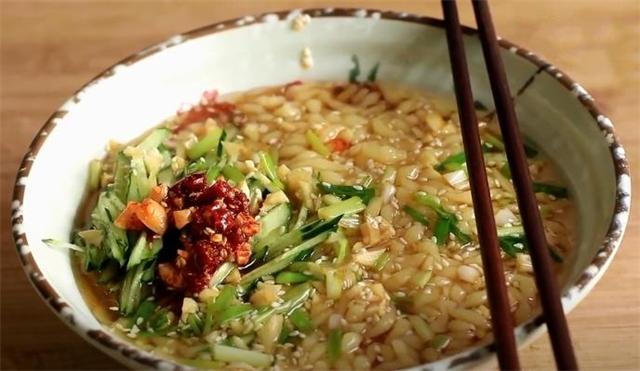 準備食材: 涼水、玉米面、淀粉、涼白開、蒜末、蔥花、白芝麻、鹽、食用油、生抽、陳醋、黃瓜絲、辣椒油 具體做法: