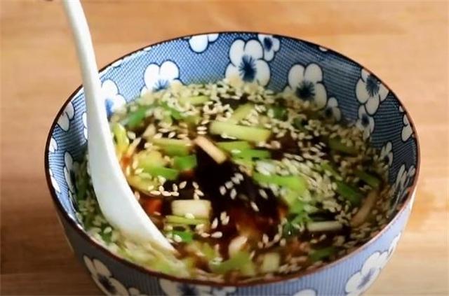 6.準備一個碗加入蒜末、蔥花和白芝麻,適量食鹽,淋入熱油,再加1勺生抽和2勺陳醋,再加點涼白開拌勻。(www.ws46.cOm)