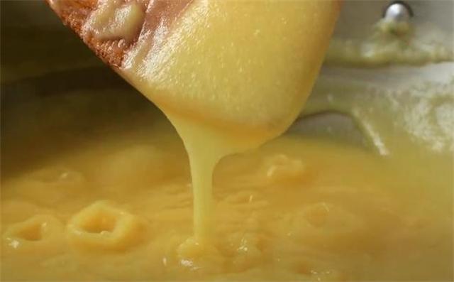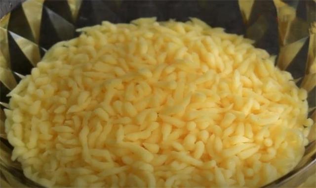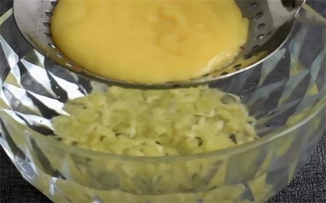5.準備一碗涼白開,玉米面糊倒漏勺上,這樣就像小魚一樣漏水里了。