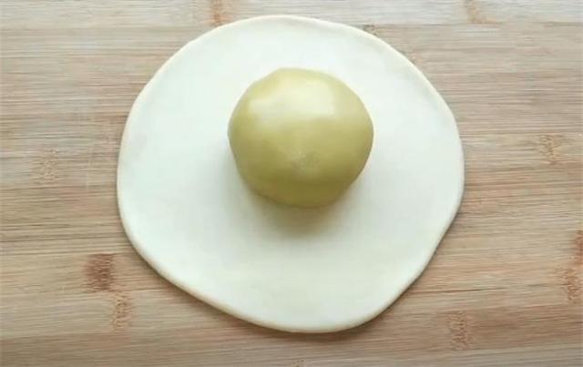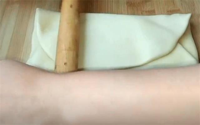 8.用手按壓下去,再用搟面杖搟薄,把餡包里面。
