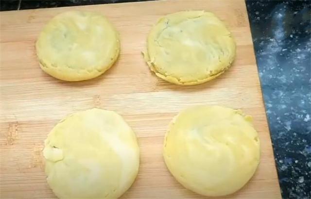4.面團醒好后稍微揉幾下,搟成大圓餅狀。