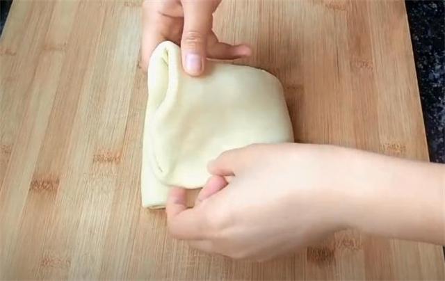 5.把另一塊面團包起來,搟大后對折起來再搟長。