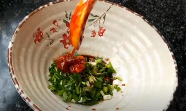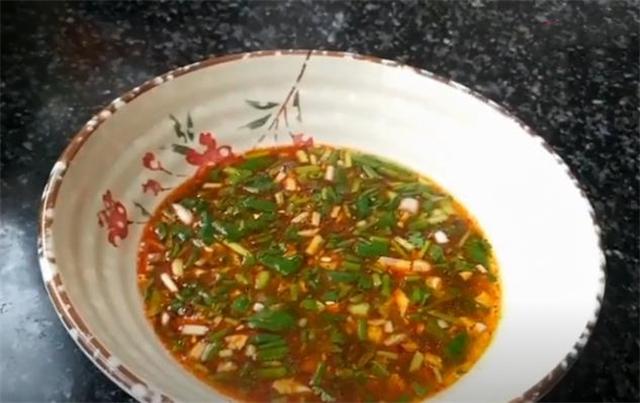 1.碗內加入蒜末、香菜和蔥花,適量食鹽,兩勺陳醋和半勺生抽,少量花椒油,一勺辣椒油。
