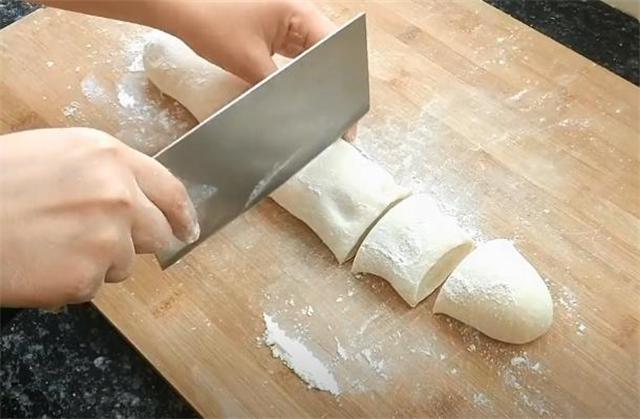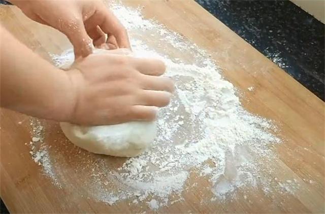 2.案板上撒點面粉,把醒好的面團揉一下排氣,揉光滑以后再撒點面粉繼續(xù)揉,就這樣重復(fù)3次揉成偏硬一點的面團。