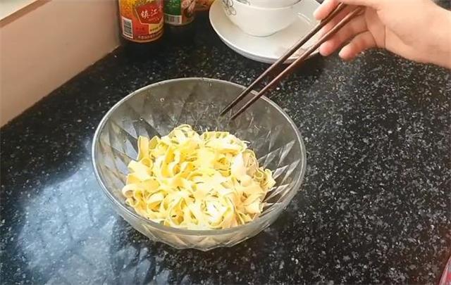 3.然后把豆腐皮放進涼水里泡涼,控干水分以后放旁邊待用。
