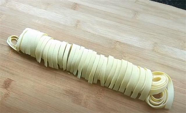 1.我們先把豆腐皮卷起來,切成一根一根的。