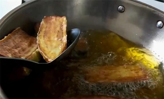 5.鍋內加入適量的油燒熱,油熱以后改小火,放入茄子炸,茄子炸至金黃色以后控油撈出。
