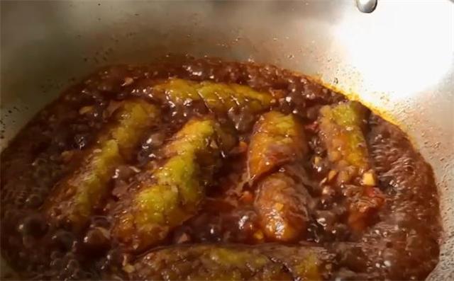 6.鍋內留少許油,倒入一勺豆瓣醬,再放入蔥姜蒜煸炒,炒香以后加入調好的料汁,料汁燒開以后放入炸好的茄子,加入適量食鹽,大火收汁后即可裝盤。