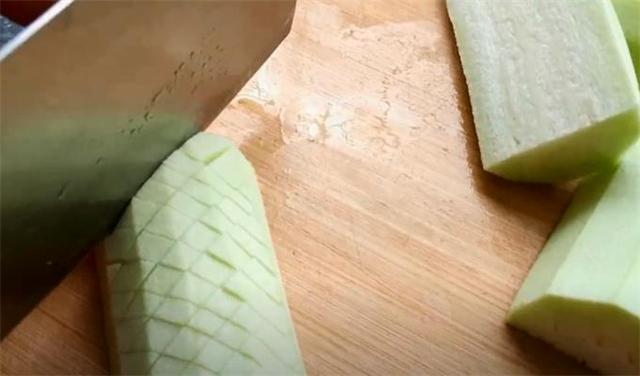 1.我們準備的食材有蔥姜蒜和一根茄子,先將茄子去皮,把茄子切成小段,再斜刀切茄子,但不要把它切斷,然后換一個方向再斜刀切,用同樣的方法把所有的茄子段都這樣切。