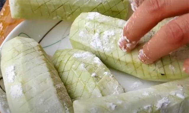 2.切好以后撒少許的淀粉,把茄子均勻地裹上一層淀粉。