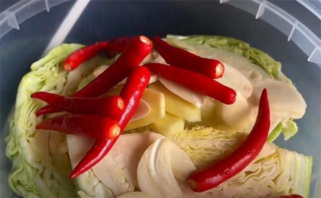 1.去菜市場買一個包菜,把它切成小塊洗凈,放入一個無水無油的容器中,加入姜片、蒜片、小米辣。