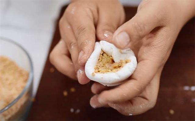 4.我提前準備了一些熟花生的餡,花生餡的做法很簡單,熟花生碎再加適量的白糖攪拌均勻即可,我們把餡料包進去。