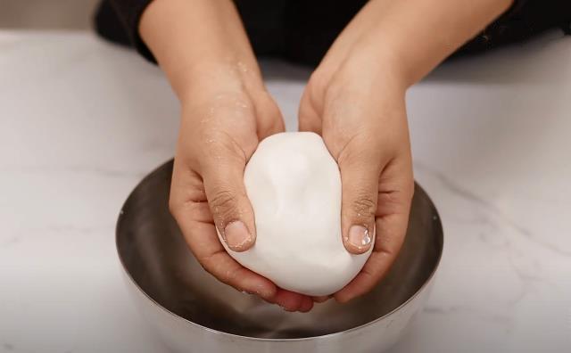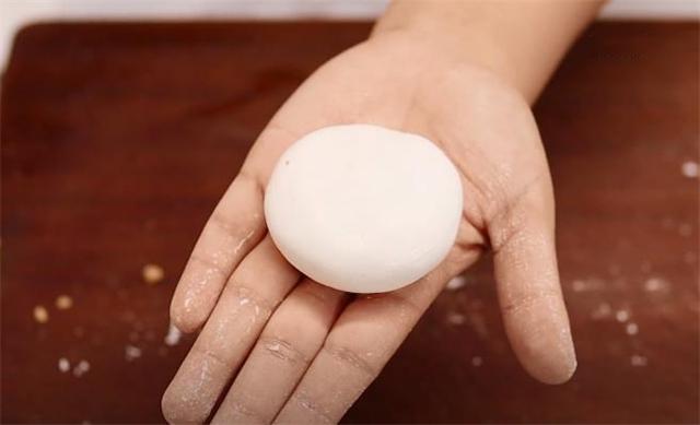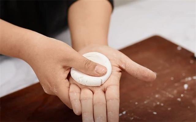 3.把小面劑子直接用手先反復的把它抓到濕潤的狀態(tài),然后在掌心揉一揉搓一搓,把它搓圓,再用大拇指向下按壓,按成小圓餅。