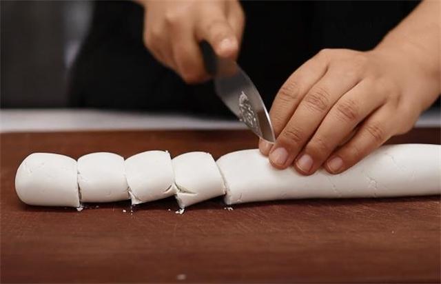 2.揉好的面團不用醒發(fā),放在案板上搓成長條狀,再用刀切成小劑子。