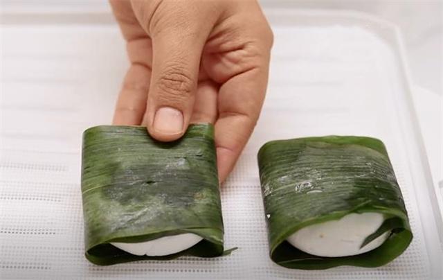 6.再準備一張粽葉,直接把它包起來,這樣蒸出來的味道會更好,實在沒有的朋友可以什么都不放,涼水上鍋蒸20分鐘。