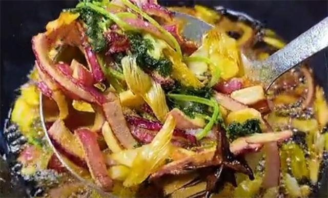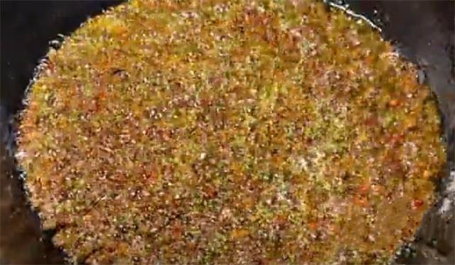 5.鍋里面多倒一點菜籽油,因為菜籽油的煙點比較高,比較適合油炸,其他的油在高溫的情況下,會產生致癌物質,而且用菜籽油炸出來的花椒油更香,油溫燒至五成熱的時候,把洋蔥和大蔥倒進去炸,然后用鏟子不停地翻動,要把香料的水分徹底炸干,炸到香料的水分半干的時候,再把大料倒進去炸,現在聞著已經非常的香了,炸至所有的香料都變得焦黃,像這樣就可以把它撈出來了,撈出來的香料是不能吃的。