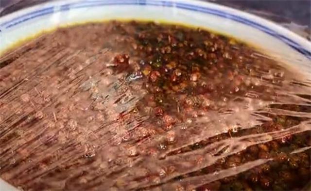 6.我們的油已經有所有香料的香味了,把油稍微放涼以后倒進花椒里面,然后蓋上耐高溫的保鮮膜,把它密封起來。
