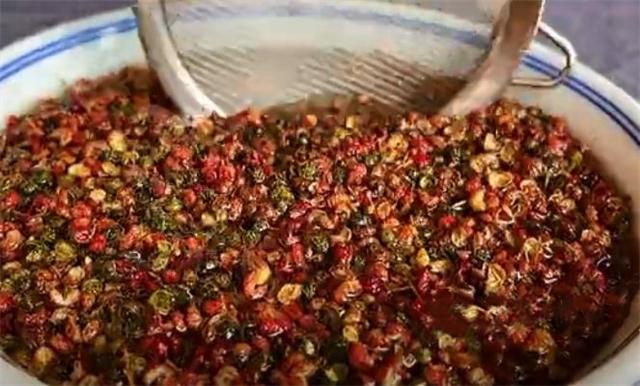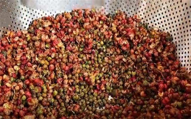 1.首先我們準備干紅花椒100g,青花椒50g,紅花椒與青花椒的比例是2:1,然后把它們放在一起,往里面加入清水,把花椒清洗一下,不用洗得太久,把表面的灰塵和雜質就可以,洗干凈以后用濾網把它過濾出來,放進盆子里面。