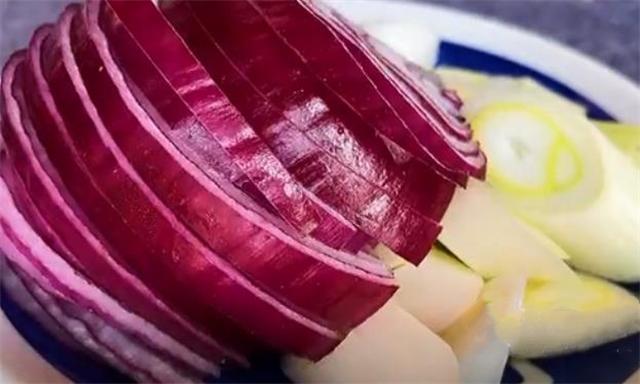 3.下面準備一根大蔥切片,切好放碗中備用,準備半個洋蔥切成絲,切好跟大蔥放一起。