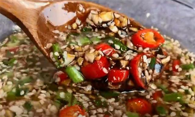 6.現(xiàn)在我們往小料里面加入一勺白芝麻,再加入適量的花椒粉,再淋入剛燒開(kāi)的熱油爆香,用筷子把它攪拌均勻,這個(gè)時(shí)候往里面加入四勺生抽,兩勺香醋,一勺素蠔油,將它們攪拌均勻,咱們這個(gè)萬(wàn)能料汁就調(diào)好了。