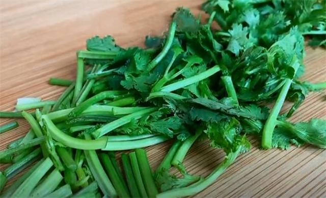4.接下來(lái)準(zhǔn)備一把香菜,將它切成長(zhǎng)段,切好以后放碗里面?zhèn)溆谩?/p>