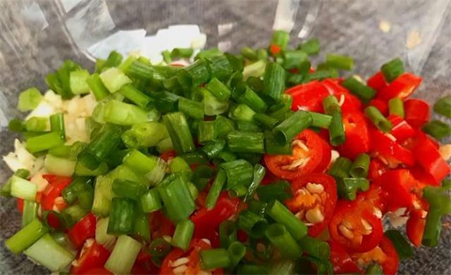 5.準(zhǔn)備一把大蒜切片,再剁成蒜末,切好以后放入碗中,準(zhǔn)備4根小米辣,把蒂切去不要,接著將它切成小圈,切好之后跟蒜末放一起,準(zhǔn)備一把小蔥,將它切成蔥花,同樣也切好放小碗里面。