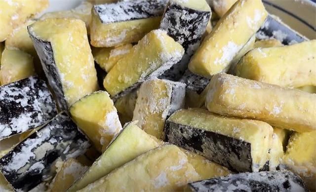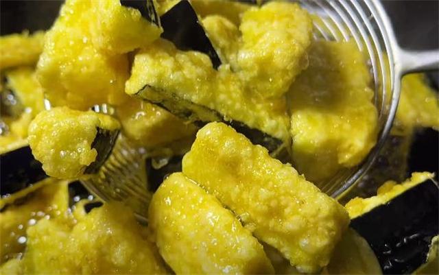 7.攪拌均勻以后,往鍋里面多倒一點食用油,開大火燒,用一根筷子放進去起小泡就可以把茄子放進去炸,如果茄子太多的話可以分兩鍋炸,炸的時候記得要用筷子不停地翻動,避免把茄子炸糊了,全程都要開大火炸,如果小火炸的話茄子比較容易吸油,炸至茄子兩面變得金黃即可,先把它撈出來放進盤子里面。