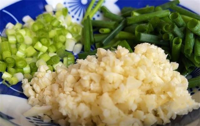 5.準備一把小蔥,把蔥白跟蔥葉用刀分開切,蔥白切成末,放碗里面,蔥葉切成長段,放入碗中備用,準備一把大蒜切片,大蒜是茄子的靈魂,這個是做這道菜必不可少的哦,最后切成蒜末,切好以后放進碗里面備用。