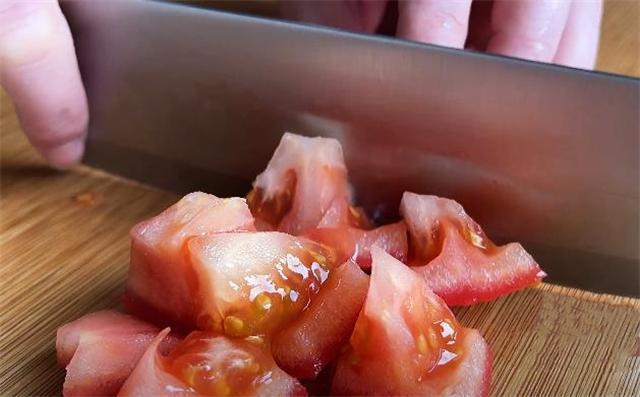 4.準備一個西紅柿對半切開,中間的硬心用刀切掉不要,先把它切成大塊,再改刀切成小塊,切好之后放碗里面備用。