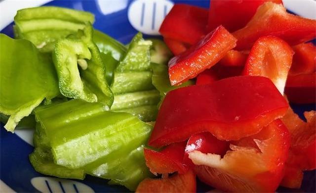3.下面我們準備一根青椒去籽,再用刀把它對半切開,最后把它切成小塊,切好以后放入碗里面備用,準備半根紅椒,同樣也把它切成小塊,切好跟青椒放在一起。