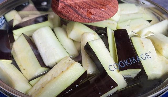 1.首先把茄子去蒂,然后再把它切成3公分左右的長段,茄子的皮千萬不要削掉,因為茄子皮含有特別豐富的花青素,再把每一個茄子段都切成長條,這樣切出來的茄子條口感吃起來比較好,全部切好以后把它放進大碗里面,往里面加入一勺食鹽,幾滴白醋,再倒入適量的清水,把茄子浸泡一下,這樣能夠防止茄子氧化變黑。