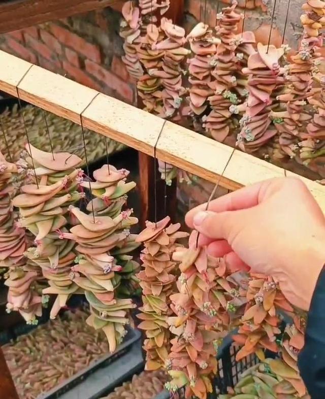 將葉子用一根線串起來,然后放到一個透氣性好的位置,因為這片區域的濕度很大,完全不需要澆水,也能自行發芽,等它將主葉中的養分消耗殆盡后,再將其移栽到盆中。 用木棍將多肉串起來,最大的優點就是不占地方,只要通風充足,多肉就不會爛掉。