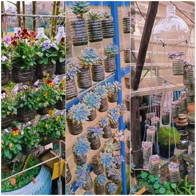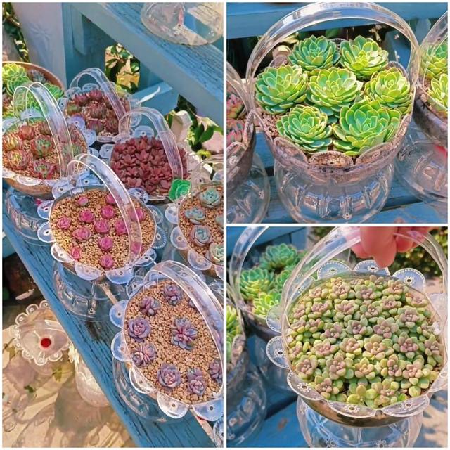 就是將一個礦泉水瓶子一分為二,上面的半個瓶子,可以作為底座,而下面的半個瓶子,就是裝飾品。 如果你有興趣,有能力,不妨試一試,送人也好。 對她來說,這些都是不要錢的,畢竟多肉都是她親手種植的,至于“廢棄”的花瓶,她也不需要再收回去了。
