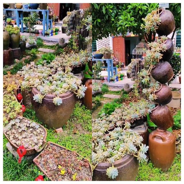 這還沒完,要不要看一看這位姑娘的花墻? 畢竟,多肉不同于蔓藤花卉,想要像月季、鐵線蓮一樣,隨手就是一大片的花海,也是非常困難的事情。 可是,這位小姑娘,卻把那些看似無用的材料,拼成了一面面的花墻。