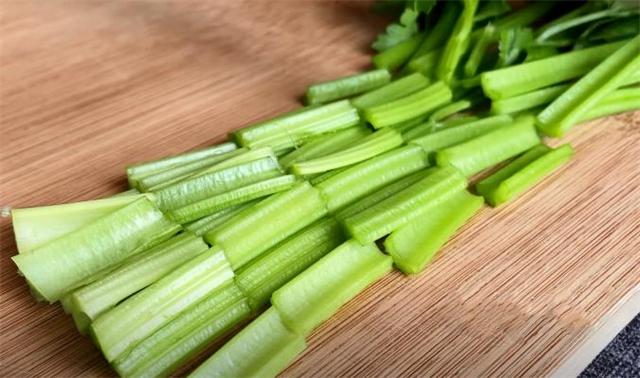 2.下面準備一根芹菜去除筋膜,然后把它切成小段,切好放入碗中。