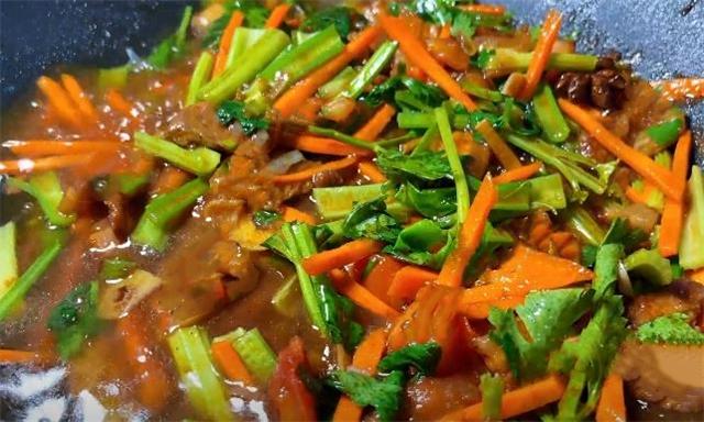 6.熱鍋涼油,放入少量的食用油,加入適量的蔥姜片以及香葉、八角,給它熗出香味,然后倒入切好的西紅柿丁,把它炒出汁水,再加入一勺食鹽,適量的五香粉,1勺味精,1勺生抽,1勺素蠔油,把所有的調味料翻炒均勻,這會兒就可以放入準備好的胡蘿卜、芹菜,洋蔥千萬別提前加入,那樣子口感不好吃,炒至所有的配菜斷生,使所有的調味料融合在一起,再倒入200毫升的清水。