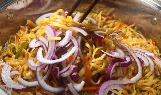 8.攪拌均勻以后直接把面條放入蒸鍋里面,用筷子把面條整理均勻,蓋上蓋子再開大火繼續蒸20分鐘,時間到了以后,我們把準備好的洋蔥圈倒進來,關火蓋上蓋子燜上1分鐘,這樣洋蔥保持著脆爽的口感,又去除一些辛辣味。