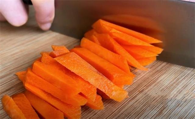 4.再準備兩根胡蘿卜,去皮以后把它切成厚片,再把它切成粗一點的條,放碗中備用。
