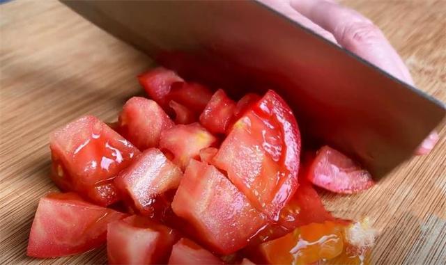 3.一個大一點的西紅柿對半切開,再把它切成小塊,放入碗中備用。