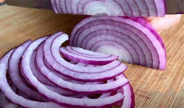 5.冷藏一夜的洋蔥我們把它切成洋蔥圈,洋蔥經過冷藏,切的時候就不會辣眼睛了,切好放入盤中備用。