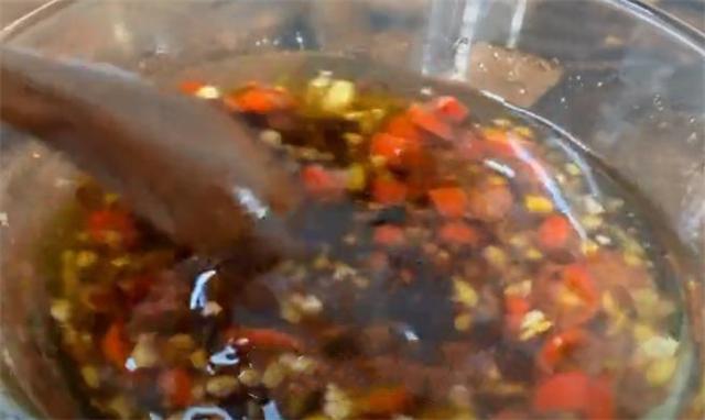 4.現(xiàn)在我們開(kāi)火把鍋燒熱,往鍋里面加入適量的食用油,油熱以后倒進(jìn)蒜末和小米辣在里面爆香,再往里面加入3勺生抽,2勺香醋,一勺蒸魚豉油,一勺食鹽,一勺白糖提鮮,最后再加一勺辣椒醬,將它攪拌均勻備用。