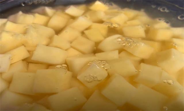 1.首先我們準備一個大土豆去皮,然后把它切成一厘米左右的厚片,再把它切成一厘米左右的長條,最后把它切成小方塊,切好放進大碗里面,往里面加入一勺白醋,再加入適量的清水,水位沒過土豆就可以,把它浸泡5分鐘,防止土豆氧化變黑。