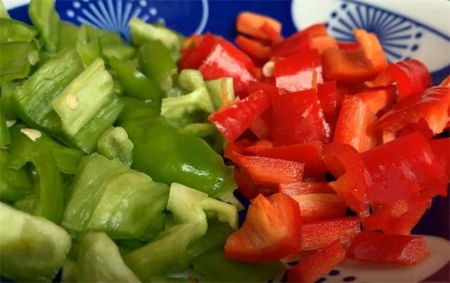 2.準備一個青椒去籽,再對半切開,先把它切成一厘米左右的條,再切成小方塊,切好放碗里面備用,準備一根紅椒去籽,先把它切成條,再把它切成小方塊,切好跟青椒放一起。