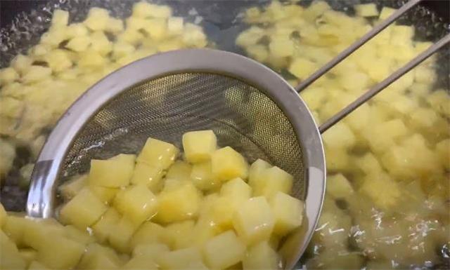 4.鍋里面加入適量的清水,開大火燒開,燒開以后往里面加入一勺食鹽,用鏟子把食鹽攪拌融化,把土豆倒下去焯一下水,焯水的時間不要太長,太長的話土豆表面會變成糊狀,焯水一分鐘后撈出控水。