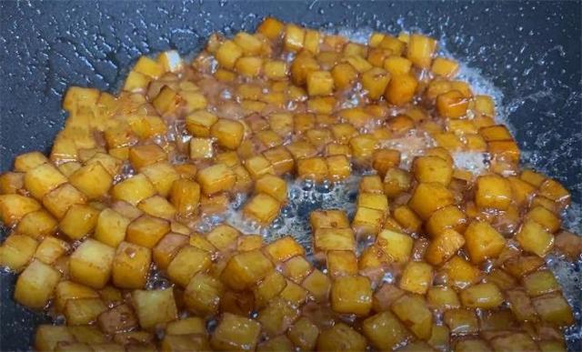 5.鍋里面放油,油熱以后把蔥末和姜末倒進去爆香,翻炒出香味,炒出香味以后倒入土豆丁翻炒,炒至土豆斷生加入一勺食鹽,一勺生抽,一勺老抽上色,一勺素蠔油,一勺味精,再把它翻炒均勻。