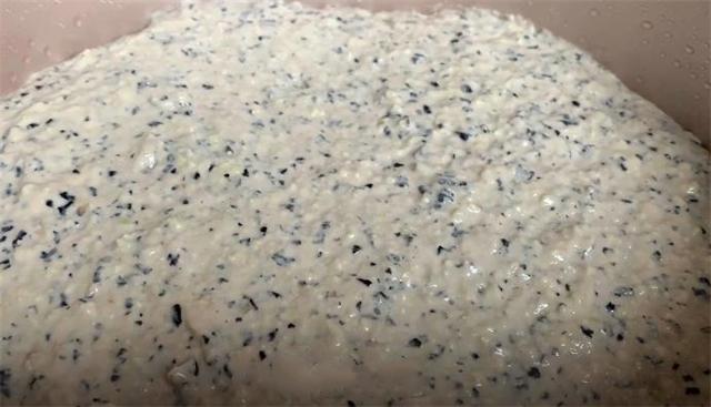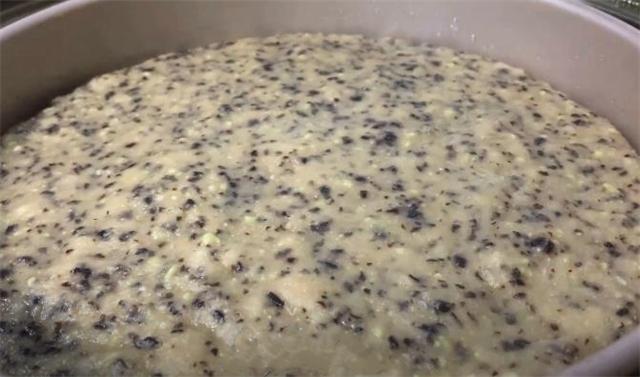 4.準備一個模具,在底部和四周都刷上一層油,防止粘黏,再加入一點黑芝麻增香,這樣也方便脫模,然后把面糊慢慢倒進來,用勺子把表面鋪平整,蓋上蓋子醒發(fā)40分鐘以上。