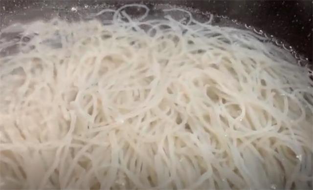 4.煮好以后把它撈出來放進涼水里面,這樣可以防止粉條成糊狀,在涼水里攪拌一下,然后把它撈出來放進大碗里面。