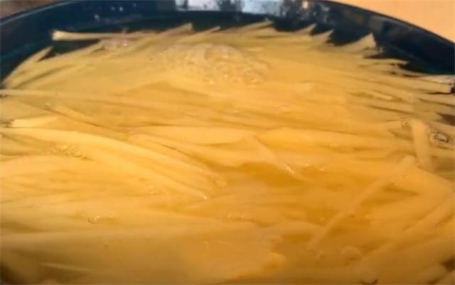 5.下面我們準備一個土豆去皮,先把它切成薄片,再把它切成細絲,盡量切得細一些,口感會比較好,切好放進碗里面,往里面倒入適量的清水浸泡一下,防止土豆氧化變黑。