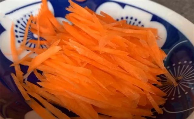 6.準備一根胡蘿卜去皮,也是先把它切成薄片,再把它切成細絲,切好放進碗里面備用。
